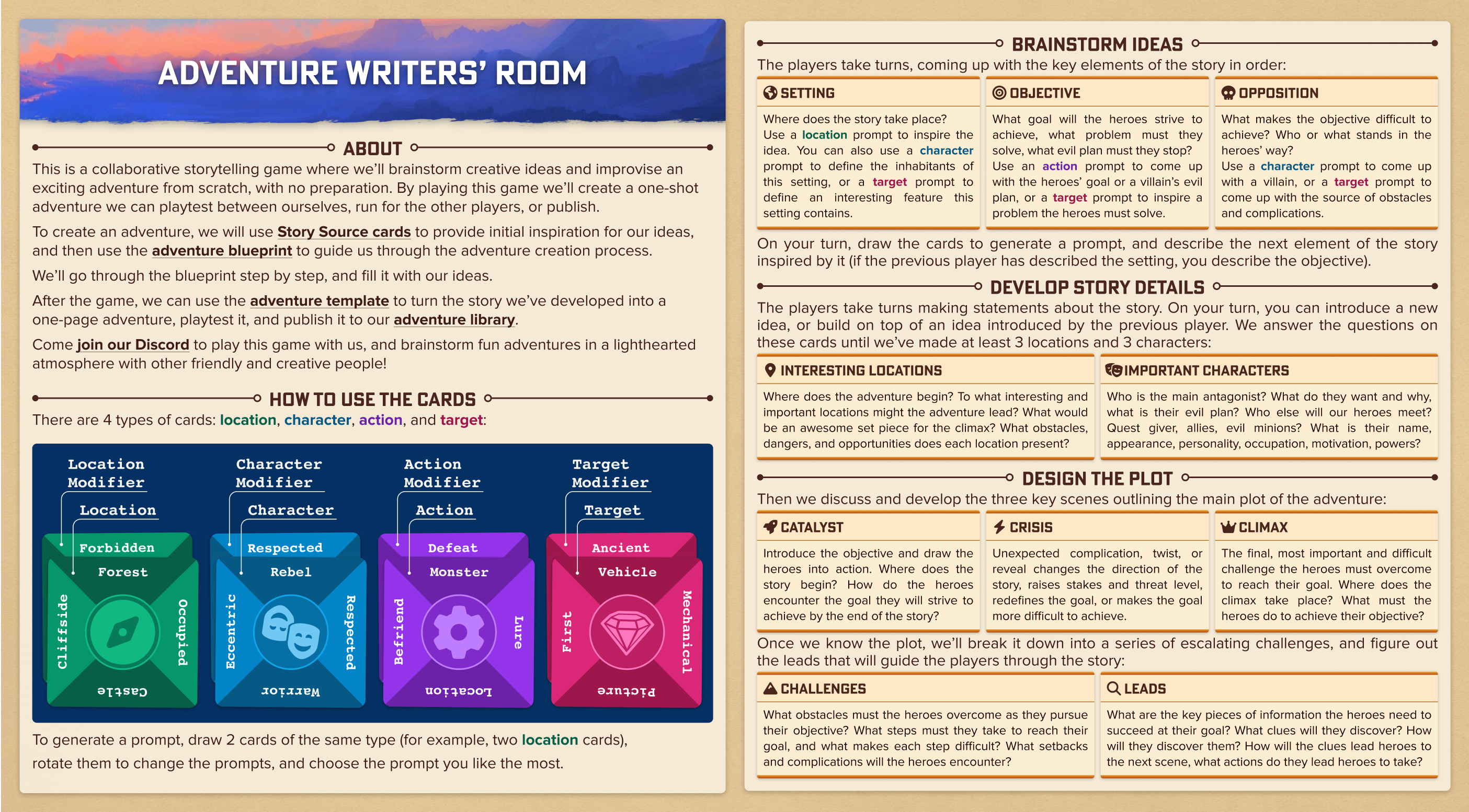 If you want to learn about our brainstorming method that makes the process of creating adventures easy and fun, you can check it out here. It includes storytelling prompts that will help you come up with adventure ideas, and an adventure template that will guide you through the process of developing your idea into a complete adventure.
